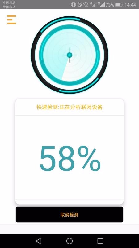 确认手机连接到wiif后,点击一键检测。等待1-2分钟,即可察看当前局域网下的联网针孔摄像头情况,能够识别市面上各种主流针孔摄像头(不支持识别家用监控等非偷拍摄像头)。