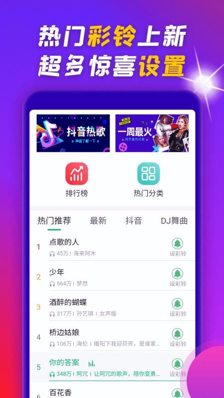 热门榜单:抖音热歌、影视金曲、欧美日韩应有尽有,更有新歌尝鲜榜,秀出风格,来电嗨起来。
