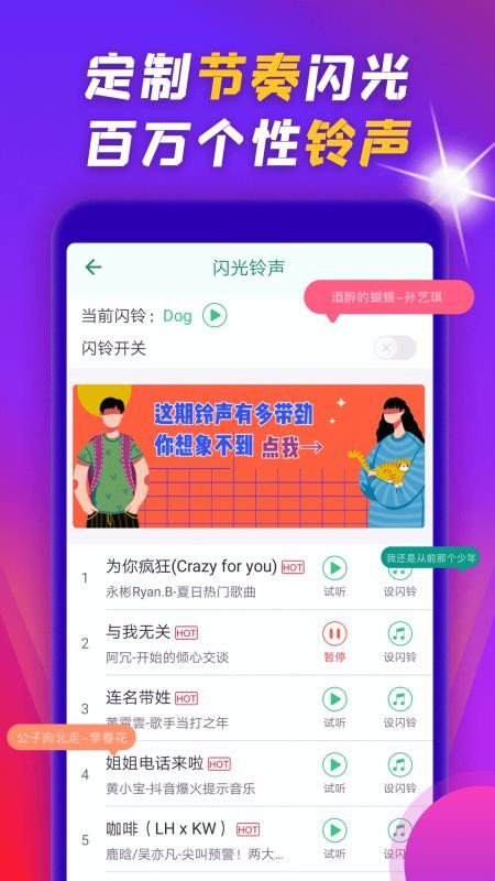 来电秀闪光灯app是一款高端私人定制的个性化闪光铃声,提供了海量的免费铃声,用户们可以轻松设置不同的来电铃声,其次,在操作上非常简单,只需要一键设置,就可以定制个性来电酷狗铃声,各种各样风格的铃声应有尽有,你喜欢什么风格的就设置什么风格的,自由性非常高,另外,闪光铃声、音乐闪光、积分翻倍,更有超多专属福利畅享随心用,感兴趣的用户赶快下载试试看吧。