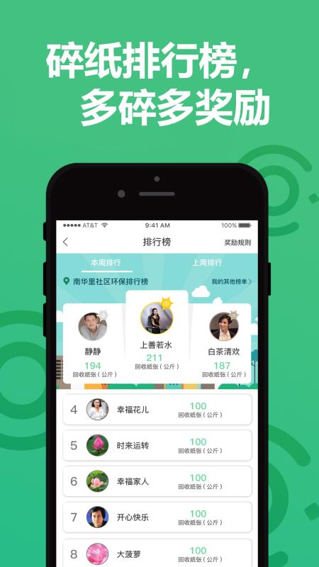 1、通过你的定位,提供了同小区的碎纸排行榜,随时可以查看上榜用户;