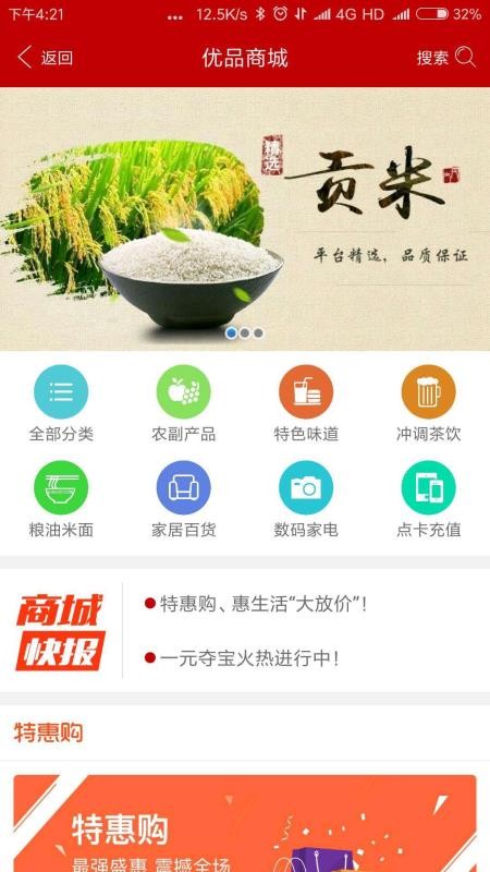 2、进入优品商城,查看商城快报内容,选择不同的分类购买自己需要的商品