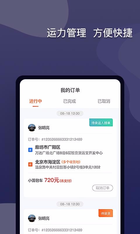 3、展示了不同的进行中订单状态,每一个订单标签上会显示待承运人接单以及待装货等标记;