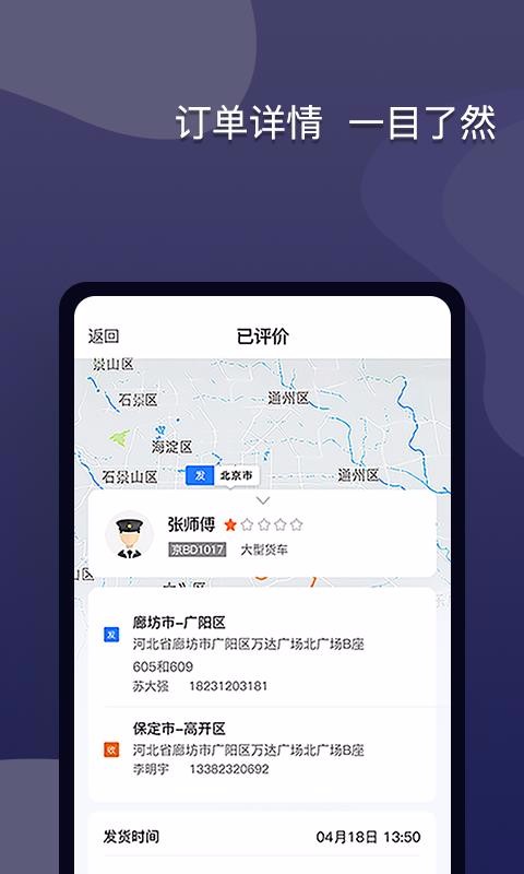 4、评价承运师傅的服务,用户能在线对自己承运的师傅以及其相应的服务进行评价;