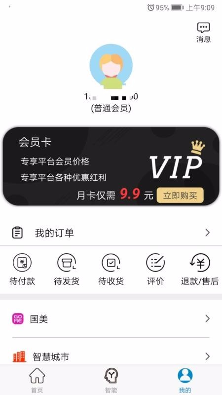 2、在我的页面,查看我的订单、国美、智慧城市