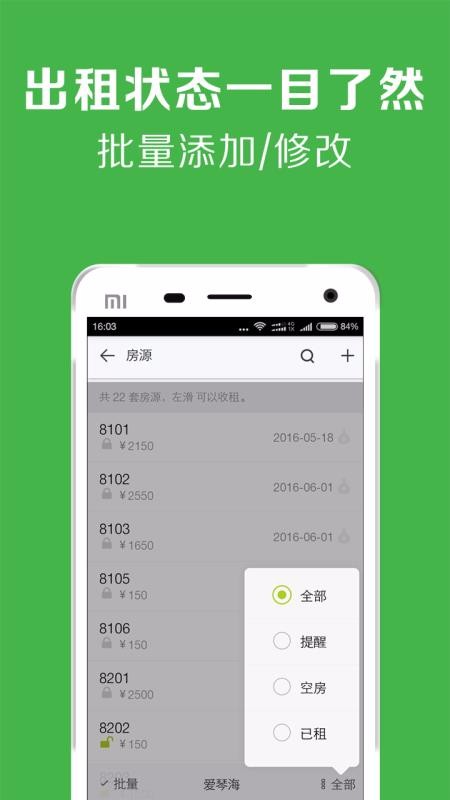 3、一目了然的房源状态,设置了提醒、空房以及已租的房间勾选区域,能自由查看不同房源;