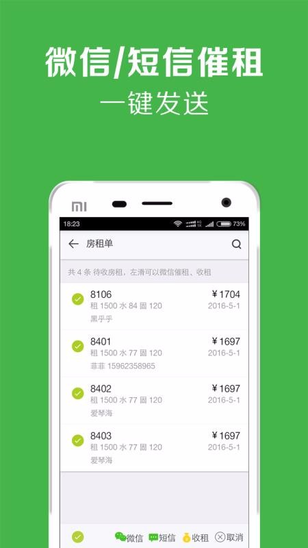 4、群发自己的收租消息,通过租房单中自动记录的消息内容可以选择群发收费消息;