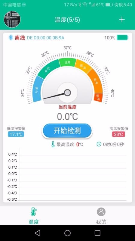 智能温度计是一个实时记录用户体温的app,可以通过蓝牙连接设备,随时接收设备测量的数据;把连接的设备放在用户身上,即可在该软件中点击开始检测,即可看到被测用户当前的温度;该软件记录着用户的最高温度和最低温度记录,还可以自行设置最高温度的界限,当达到该界限时,该软件就会自动进行报警,提示用户该采取相应的措施;在这里还可以查看温度记录的明细,该软件提供了相应的折线图供你查看,你可以查看每个时间段温度的变化情况,并且还可以查看历史的温度数据,用户也可以将该温度报告进行分享或保存。