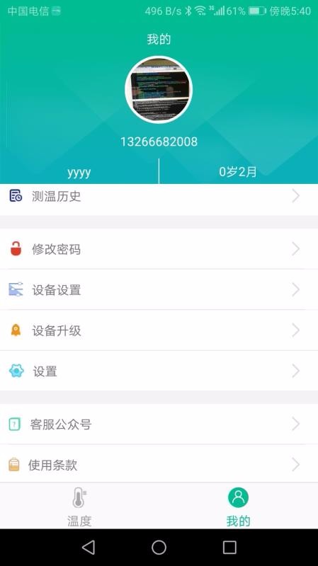 2、在我的页面,查看测温历史、修改密码、设备设置等