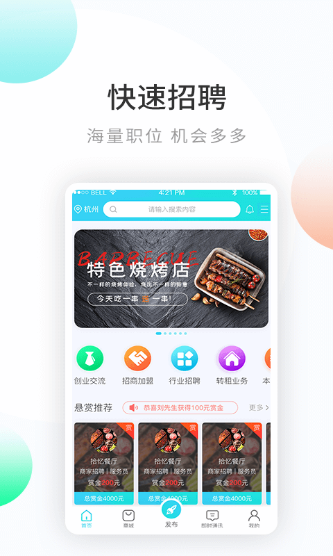 美帮餐服是一个面向餐饮行业提供的服务软件,为餐饮行业人员们打造了创业交流、招商加盟、行业招聘以及转租等业务;目前有打算进入餐饮行业创业的用户可以到该软件中与平台其他有经验的好友们交流,通过沟通交流获得自己想要从事的餐饮类型,或从交流中得到自己需要准备的相关经验等;用户也可以作为加盟商加盟到平台上面,加盟到平台就能得到平台的推广福利,在该平台上轻松管理自己的店铺,随时查看店铺的营收情况;这是一个整合了商家丰富产品资源与全网顾客资源的平台,不仅能在平台上销售管理店铺,也可以在平台的商城中购买产品。