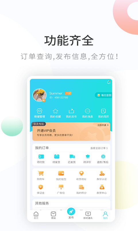 4、个人中心设计了丰富的管理功能,拥有广告位管理、订单管理、商铺管理还有更多其他服务;