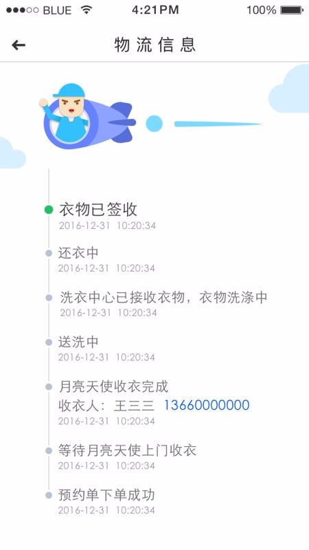 3、清晰的洗衣订单物流,展示了当前订单所处的位置,可以看到衣物洗涤中的状态;
