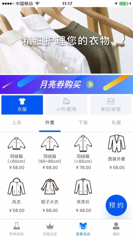 3、按照衣物类型选择内容预约,通过选择相应的衣物类型得到相应的核算价格;