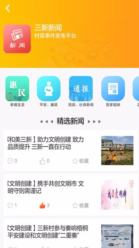 和美三新app是实现村民与村委互动交流的平台,村委有任何的事件新闻都能直接在平台中发布,使用本款软件的村民都能接收并查看,村民在有任何疑问时也能直接在文章中提出,村委负责人在线为所有的村民进行回复,快速与村民互动;如果用户是村委,可以直接在平台中了解三务公开的信息,在三务公开信息中查找出惠民的新闻信息;用户还能直接在软件中观看民政和社保新闻、精选新闻文章,点击就能查看平台推荐的文章内容,喜欢的文章还能查看其他用户的评论,参与到他们的评论中,发布自己的看法,轻松与他人互动交流。