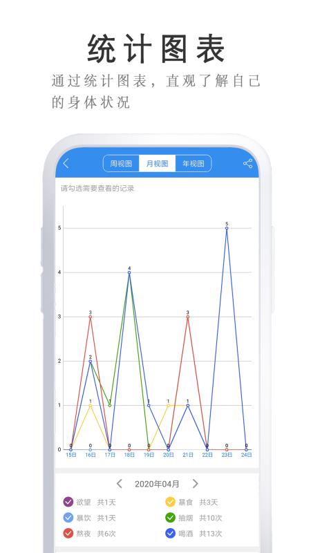 3、统计图表,提供了周视图、月视图和年视图三种统计图表;
