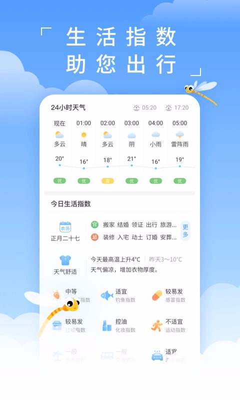 蜻蜓天气是一款天气实时查询工具,只要安装软件就能打开查看今天天气,不需要登录注册就能使用;它会根据春夏秋冬不同的季节会推送相关的生活建议指数,让用户们能根据提示获得更加美好的生活,以后出门实时都能预测下雨情况、刮风情况以及温度情况等;当拥有了这样一款软件后就能不用再担心刮风下雨没人接了,通过这个软件中播报的天气预报信息能自己备好相应的准备,做一个自给自足的人,也不用羡慕别人有人接而心酸;软件同步了周围天气预报基站的检测数据,能精准的定位到每一个位置上面的天气变化情况,了解到该地图的温度与降雨预警等。