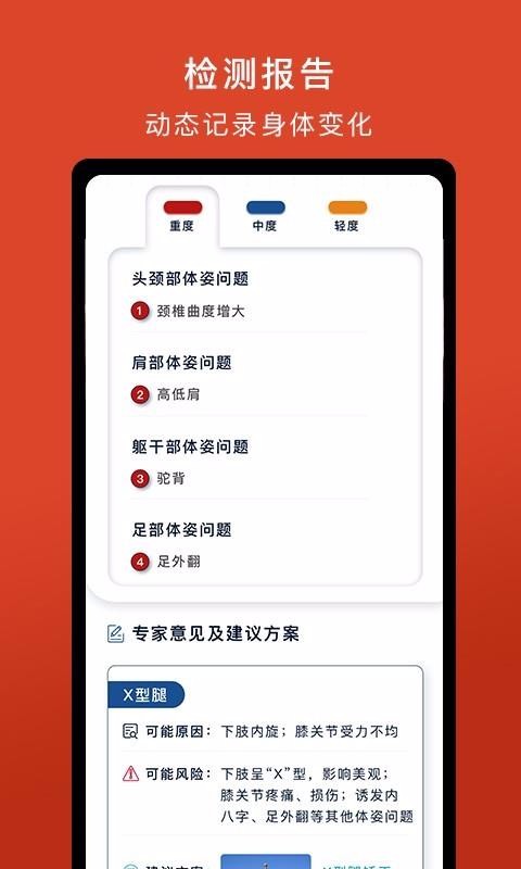 2、检测报告,根据测评分析你的20项体姿问题,并给出专家意见;