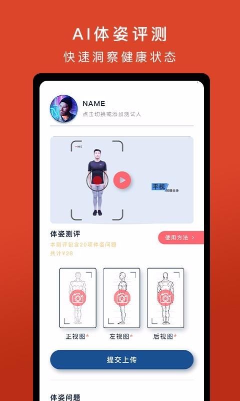 1、体姿测评,上传个人的正视图、左视图和后视图,即可等待测评结果;