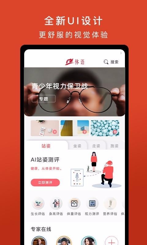 体语是一个专门评测体姿并提供改善报告的软件,可以进行站姿、坐姿、走姿和跑姿的评测,拍照后录像上传相应的照片,自动为你进行评测;在体姿评估结束后,为你提供了检测报告,分析了重度、中度、轻度三方面分别存在的问题,并且好提供了专家意见和改善方案;除了体姿评测外,还可以进行生长评估、身高评估、体重评估、营养评估等;还有各种科普专题,也提供了相应的视频解说,助力于青少年的成长;用户还可以直接在该平台中查找相应的专家进行在线咨询,与专家一对一的交流你存在的问题,并给出针对性的建议。