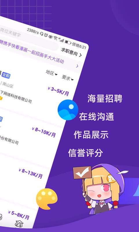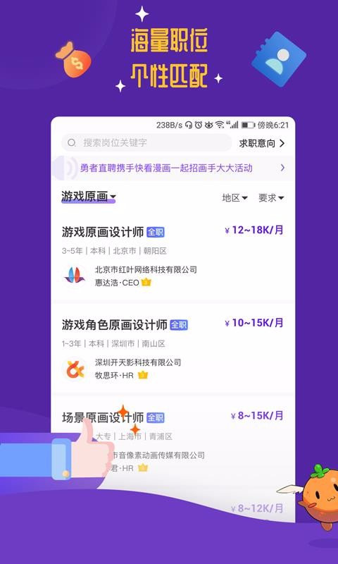 2、海量的招聘信息,平台汇集了各科技游戏公司以及动漫公司的招聘信息资源;