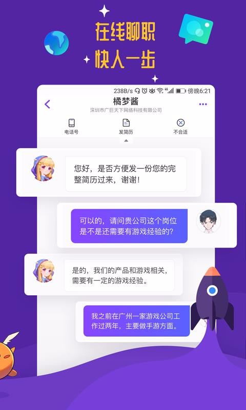 勇者直聘是一款面向二次元人才市场设置的招聘软件,平台上主要为二次元人才们提供了漫画短视频编辑、游戏美术设计师以及有声小说编辑等关于二次元方面的岗位;只要自己在平台上完善了自己的兴趣爱好或自己的相关经验与对应的证书等信息,就会根据这些信息筛选出符合用户自己的个性化岗位资源;针对相同的职位还会提供许多类似的资源信息,当用户想要了解职位详情的时候只要点击职位标签就能打开查看详情,还能在与招聘者在线沟通的界面中展示自己的创意作品,进一步提高招聘者对自己的了解,另外也提高自己被邀请面试的机会。