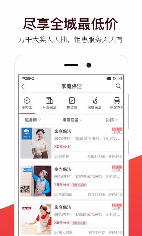 2、品类丰富,包括家政、保洁、维修、搬家、洗衣、按摩、美容等等上百个品类;