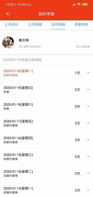 1、实时能够查看用户当前的出勤情况,每一次的考勤都能够实时进行记录;