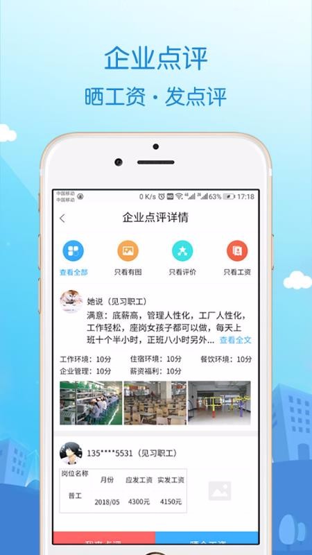 3、查看点评:支持查看企业的点评详情,可以选择查看图片、评价或者工资;
