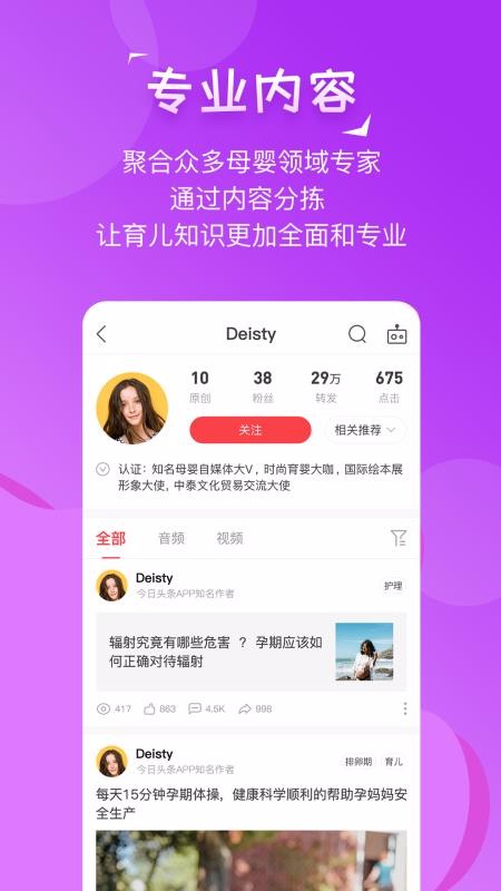 5、进入育儿专家的个人界面可以查看专家发布的相关育儿知识,还能点赞,转发、留言等