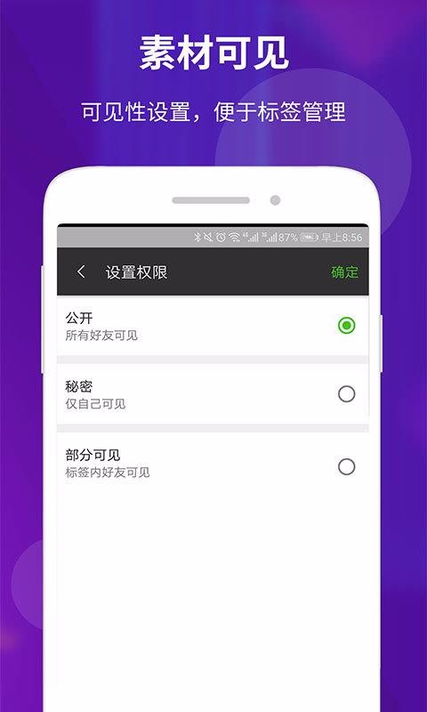 2、支持设置部分好友可见,这样就能指定特别标签内的好友才能见到自己的素材;