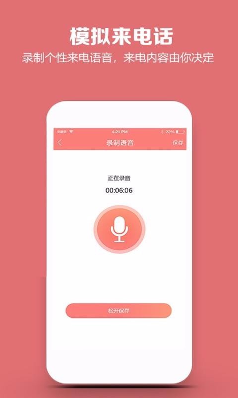 模拟来电话是一个模拟来电模式的软件,你可以利用虚拟来电来为你解决当前尴尬的场景,或者恶搞朋友;你可以自行设置来电的时间、来电用户、来电壁纸、来电语音、来电铃声等,而该电话就会根据你的设置进行准时播放来电;支持设置多个来电模式,而每一个来电还会实时显示倒计时,当你不需要该来电直接关闭即可;在该平台中的来电背景类型多样,你可以进行预览后选择合适的背景进行设置;也可以自行录制来电语音,录制的时间和内容不受限制,保存该录音后,来电即可按照录音来播放相关内容。