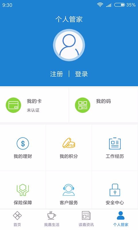 5、点击个人管家,进行嘉兴市民卡认证,查看二维码,查看我的积分等