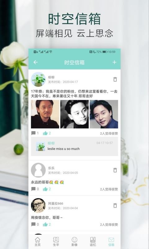 4、提供时空信箱功能,用户可以发表自己的想法,说出自己的怀念之情;