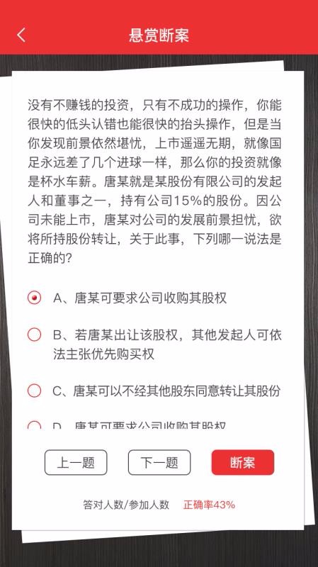 1、悬赏断案:推出众多的法律问题,可以在线进行题目的解答选择正确答案等;