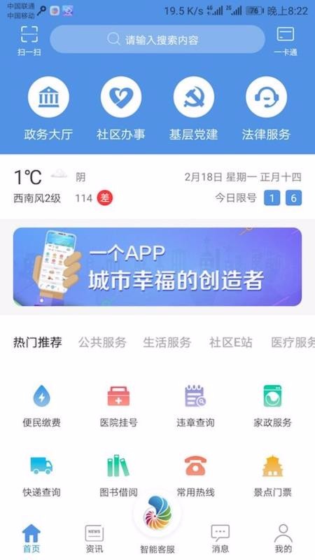 幸福秦皇岛还有多类的服务项目,热门推荐便民缴费服务、医院挂号服务、违章查询服务以及家政服务等不同的服务项目,还有政务大厅、社区办事、集成党建里面的服务功能可以使用;资讯页面划分推荐资讯新闻、身边事、政务信息,推荐节假日活动宣传资讯新闻,有省内重点智慧城市的转型措施,还有关于货币方面的新闻;方便快捷的城市一卡通服务,使用一卡通可以乘坐城市的公交车,还能使用其他一卡通服务,支持在这里充值自己一卡通的余额;从天气预报中关注今天的天气情况,从今日限号中知道今日限号的基本情况信息内容。