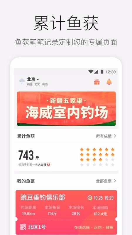 2、实时记录你在钓场内的鱼获,还可以查看本场排名、鱼获斤数、星级值等;