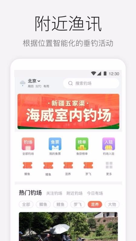 4、可以查看附近的热门钓场,还可以根据鱼类来选择钓场;