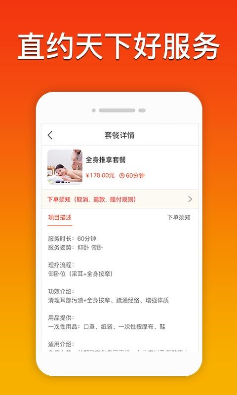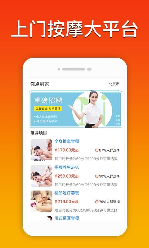 你点到家是一款提供按摩服务的软件,用户在家里就可以快速的进行使用,满足你的需求,让你能够得到更多的服务需求,及时的解决你的问题,让你在平台里可以随意的进行使用。这款软件的功能非常的多,用户可以在家里进行预约,所有的服务类型全部展示在平台里,你可以根据自己的情况快速的进行选择,让专业的人员上门进行服务,满足你的需求,得到更多的帮助。平台里的按摩人员都经过专业的训练,拥有优质的服务态度,而且平台里提供绿色健康的服务,为用户提供高标准的养生健康体验,让用户可以安全的进行使用。
