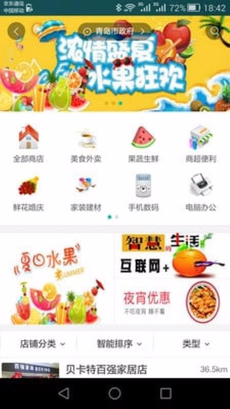 3、在首页点击商城,即可进入商城进行购物,并根据定位为你推荐附近商家