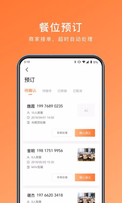 2、预定管理:支持查看顾客的预定信息,查看详情进行订单安排;