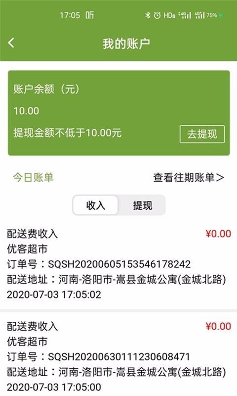 4、查看往期的账单,各种收入、提现的订单,随时进行统计,随时查看;