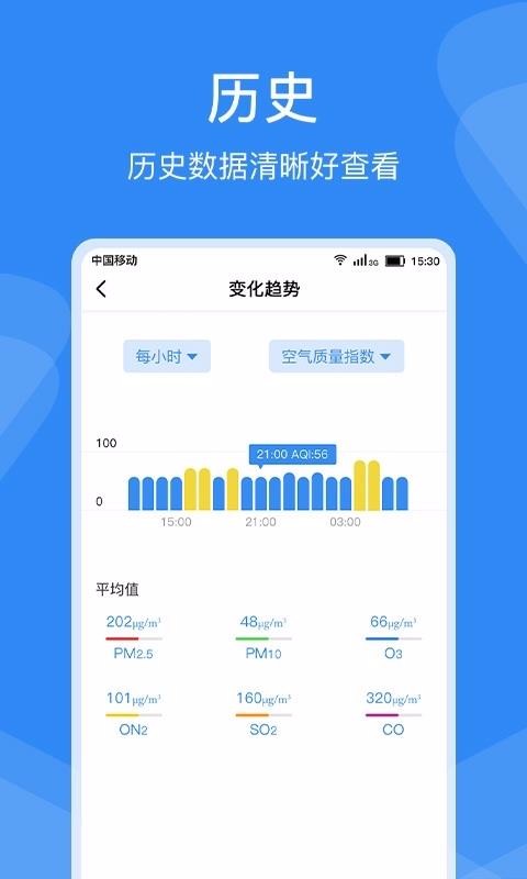 5、支持查看空气质量的历史数据,了解过去空气质量的变化趋势、污染物含量的平均值等;