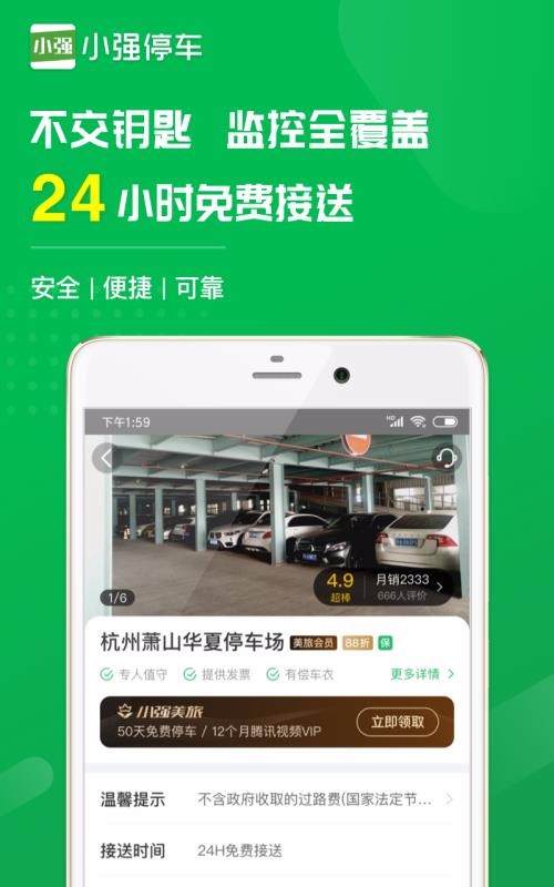 5、进入停车场的详情页面可以查看停车场的照片、名称、评价、评分、接送时间和温馨提示等内容