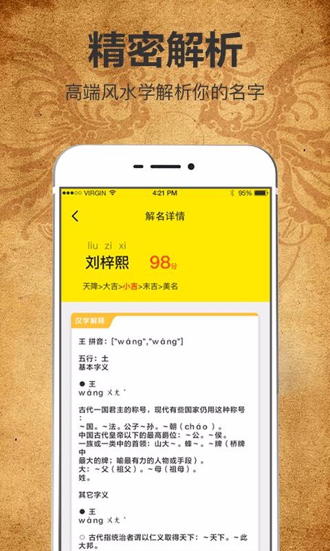 5、有详细的名字解析,里面展示了每一个名字中的汉字详解,拆分出每一个字;