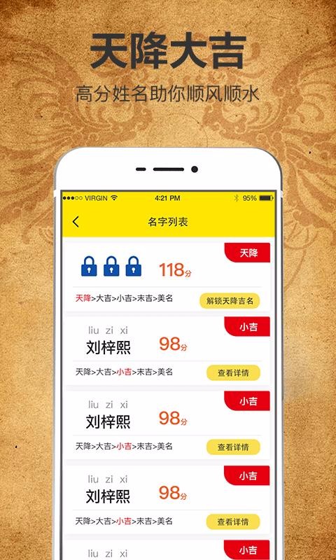 2、海量高分名字帮助顺风顺水,只要搜索好名就能检索到海量高分好名字列表;