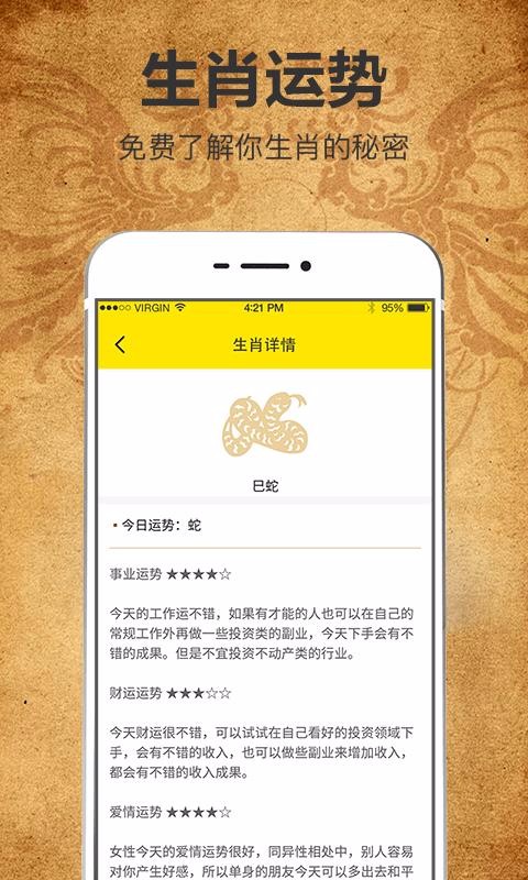 6、生肖详情中提供丰富的运势内容,包括今日运势、事业运势、财运运势、爱情运势等;