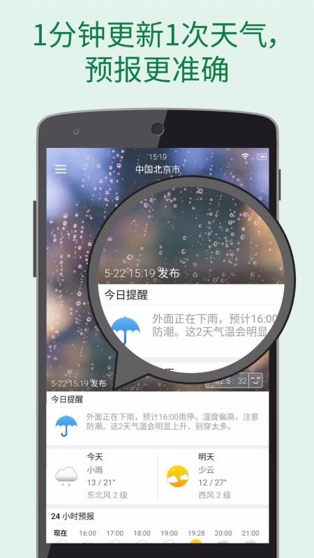 更准天气是一个天气预报app,只要打开定位,就会为你推送当地的天气状况,并且一分钟更新一次天气,给你准确的天气数据;除了准确播报当天的天气外,还会提供未来15天的天气预报,让你提前了解天气状况;天气报告的准确度精确到每一分钟,会告诉你几点几分会开始下雨;该软件中也会报告当天的温度、风力、湿度、紫外线、空气质量等数据,给你当天外出游玩、穿衣等提供建议;同时湿度数据会给你提供24小时湿度报告和未来五天湿度报告,让你随时了解潮湿天气,给你晒衣物做好提醒,让衣物不再发霉。