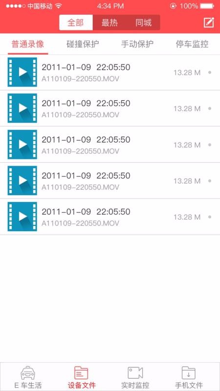 3、点击设备文件,可以选择普通录像、碰撞保护、手动保护和停车监控的录像视频进行删除或下载