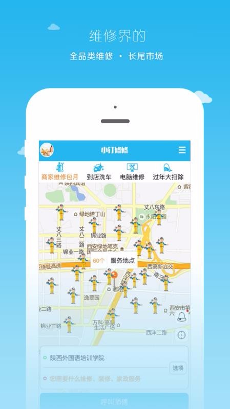 小钉修修是针对生活中的维修需求设计的软件,当用户的家里面有需要维修的设备时就可以在线发布维修订单群发给附近的师傅,师傅们会在周围接收到订单信息,他们抢单后会显示接单成功的师傅信息,马上就能为你提供上门维修的服务;这个应用类似于打车应用软件,同样可以在地图形式下看到周围分布的师傅信息,地图上方显示了维修的项目分类,快速点击这些项目就能针对性的发布该类维修需求;该软件会展示多个抢单成功的师傅列表,用户能有选择性的选择自己想要雇佣的师傅,在选择师傅之前可以先查看该师傅的详细信息,根据详细信息挑选师傅。