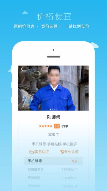 6、详细的师傅信息,里面展示了师傅的接单总数、评分、等级以及价格明细等;