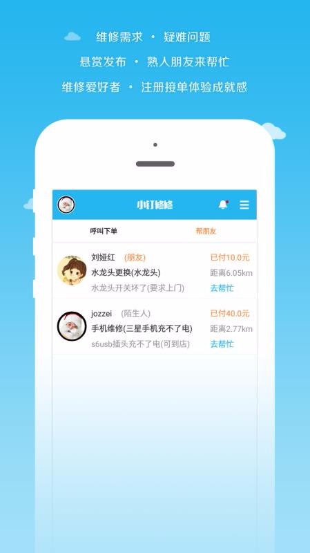 4、在帮朋友栏中查看维修需求信息,选择去帮忙功能来去帮助朋友维修并赚取维修费;